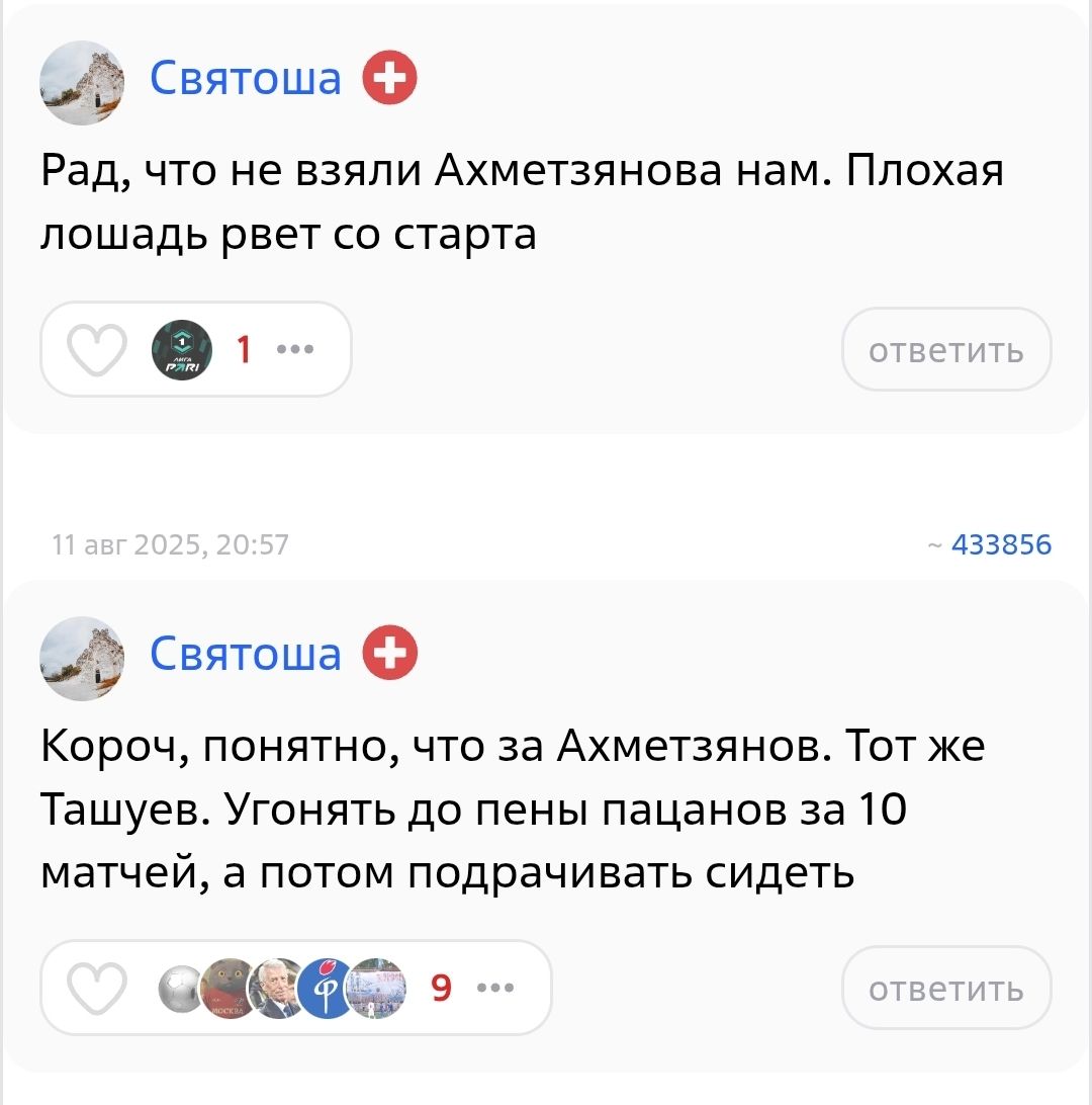 Короч, понятно, что за Ахметзянов. Тот же Ташуев. Угонять до пены пацанов за 10 матчей, а потом подрачивать сидеть