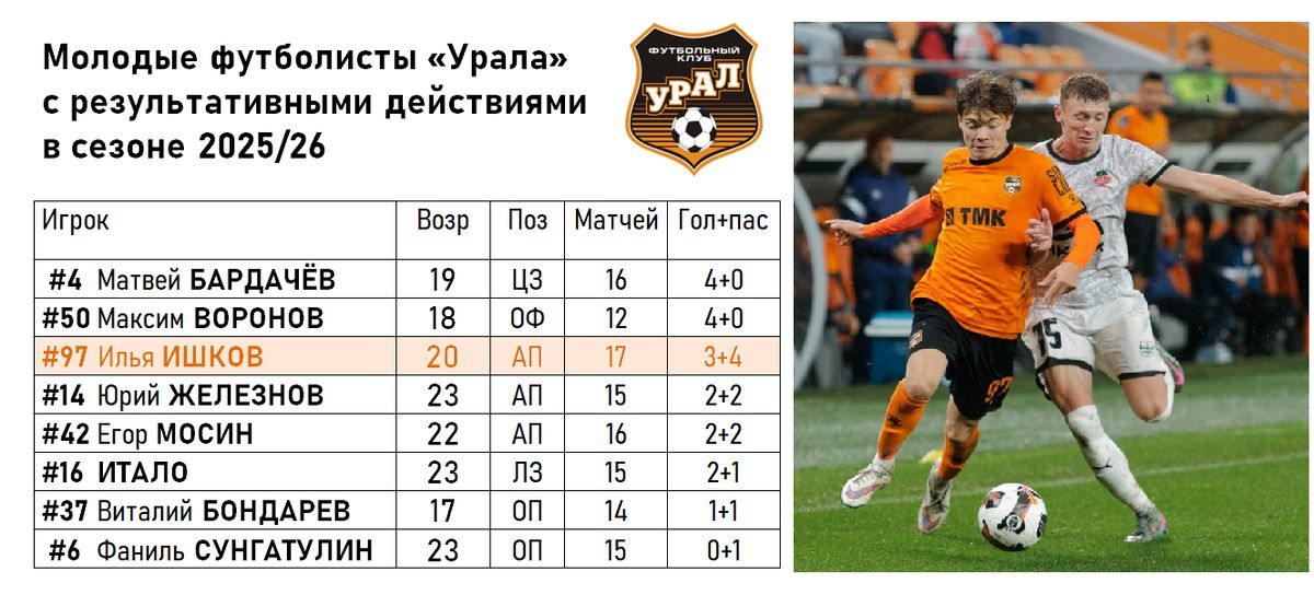В сборной первой части сезона также оказались атакующий хавбек Николай Гиоргобиани, полузащитник Равиль Нетфуллин, который также является капитаном команды, и оборонец Станислав Магкеев.