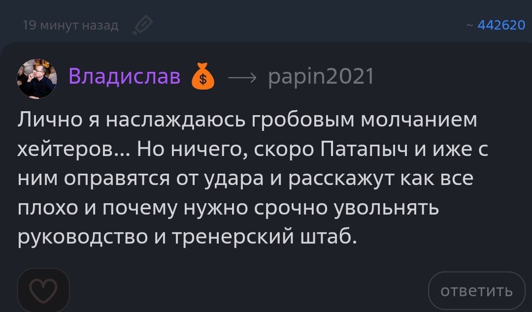 Там мания,величия зашкаливает.Если человек высказывает свое мнение,которое не совпалает с его, как он считает самым верным,то вам начинают указывать на то что вы нытик и не настоящий болельщик Факела.Только как оказалось все доводы про эти 6 из 6 и всякие таблички xg оказались мыльным пузырем и по итогу благополучно слился,еще при этом обиделся что его затравили здесь и что весь гест превратился в наглецов..