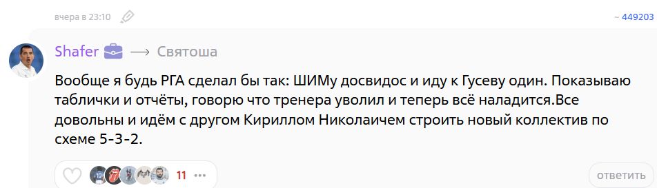 Вообще я будь РГА сделал бы так: ШИМу досвидос и иду к Гусеву один. Показываю таблички и отчёты, говорю что тренера уволил и теперь всё наладится.Все довольны и идём с другом Кириллом Николаичем строить новый коллектив по схеме 5-3-2.