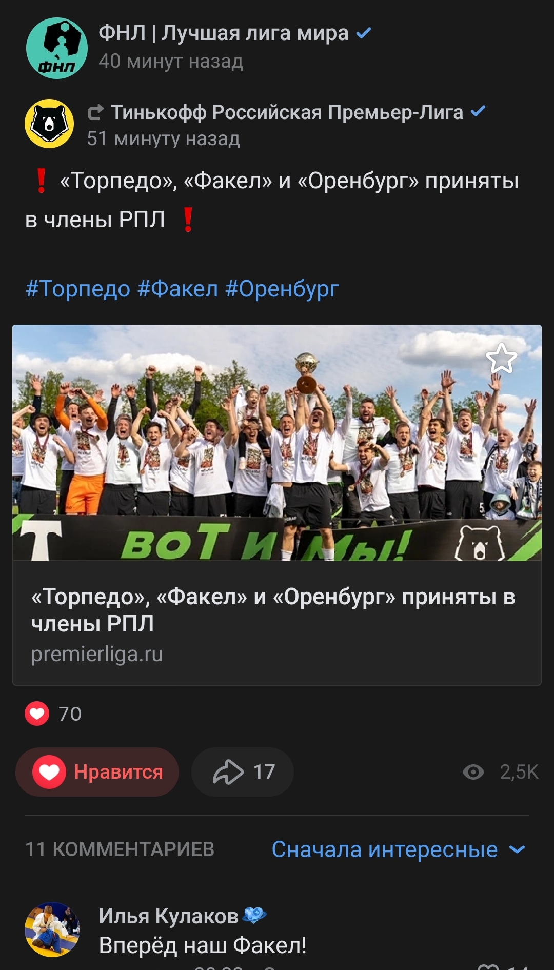 «Торпедо», «Факел» и «Оренбург» приняты в члены РПЛ