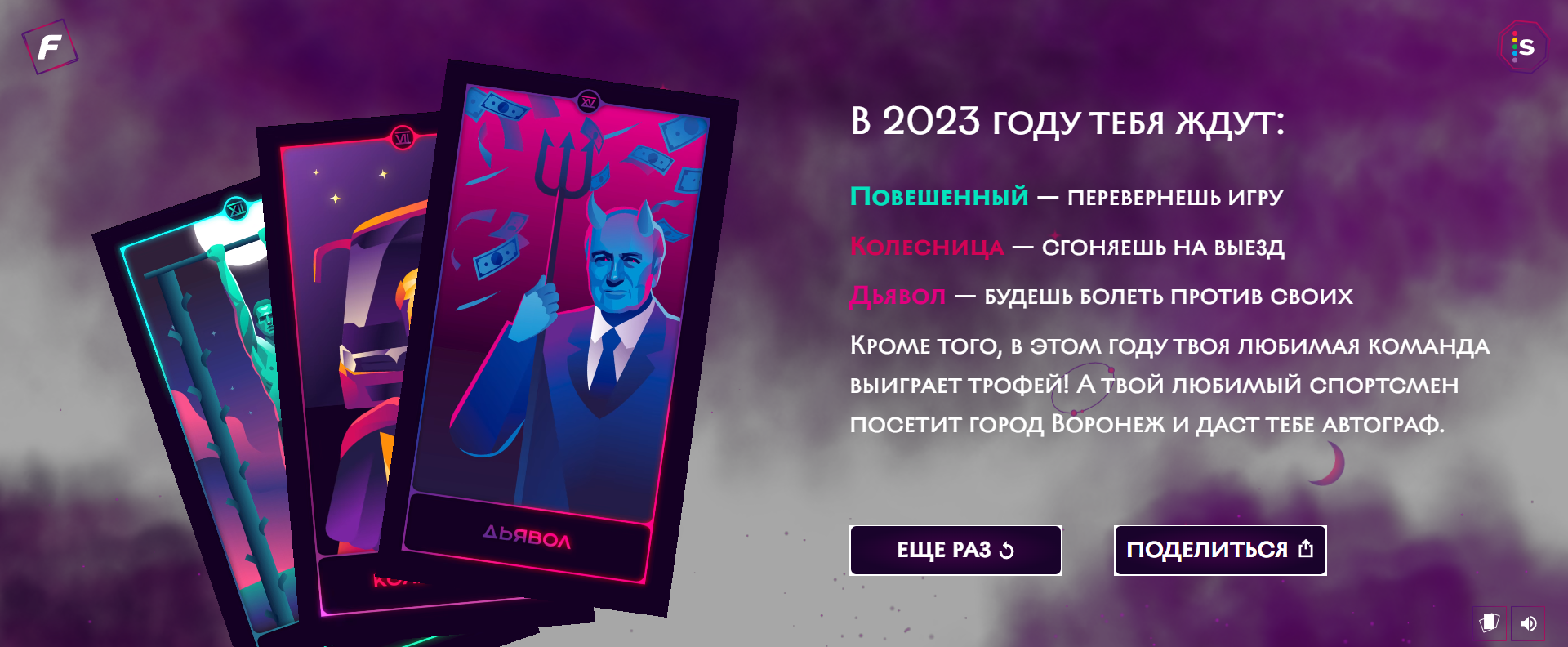 очень интересный “расклад”. это что ж должно произойти, чтобы я против Факела болел??? и какой трофей Факел выиграет? золотой граммофон за лучшее исполнение песни Туман? а вот про спортсмена порадовало - надеюсь, царь Ираклий ещё раз даст автограф, только уже в человеческое время, а не в середине рабочего дня