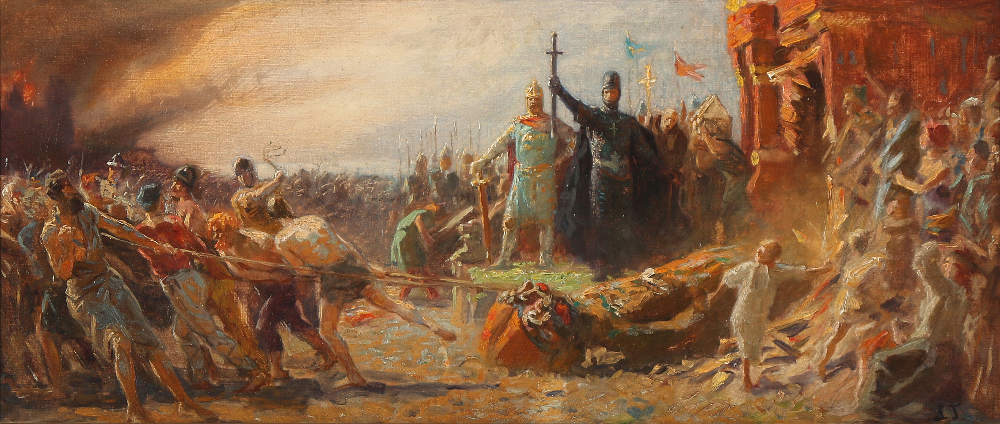 То, что история славян старательно замазана, думаю смысла спорить нет. Прошлое иногда смотрит на нас в т.ч. и через произведения искусства. Вот Туксен изобразил 1168 год. Воинствующие христиане под предводительством епископа Абсалона уничтожают статую бога Святовита (по другим данным Свентовита) в Арконе, которая считается была западным городом-крепостью славян. Аркона, и это установленный факт, находилась на о.Руян (нем.Рюген).