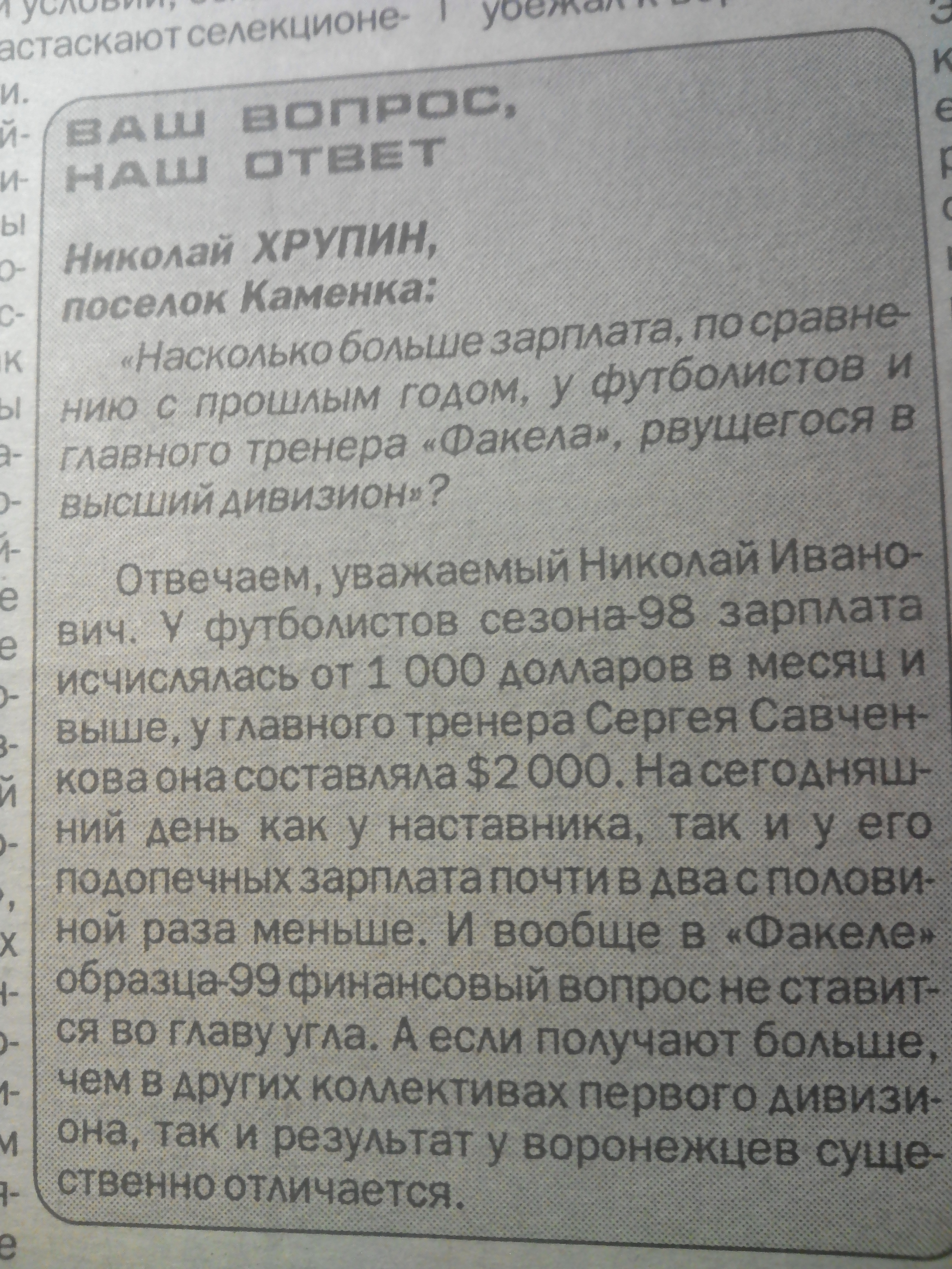 Или вот Ильёв как любит посмаковать зарплатную ведомость Факела. Тоже избитый сюжет! Дай Бог, чтобы мы в течение сезона могли ответить на все эти наскоки "интересующихся читателей" как-нибудь так: