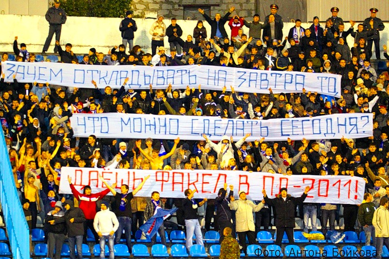 Лозунг "Пока едины - мы непобедимы" в моём понимании никогда, подчёркиваю, никогда не относился к болельщикам Факела. Сколько я себя помню, сине-бело-красное сообщество всегда пестрило разнообразными, порой соперничающими группами (и это даже хорошо). Я всегда видел основной посыл этих слов в единстве болельщиков с командой, а не друг с другом.