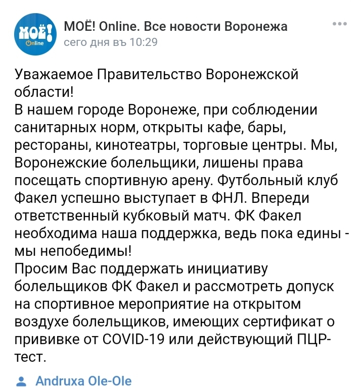 В нашем городе Воронеже, при соблюдении санитарных норм, открыты кафе, бары, рестораны, кинотеатры, торговые центры. Мы, Воронежские болельщики, лишены права посещать спортивную арену. Футбольный клуб Факел успешно выступает в ФНЛ. Впереди ответственный кубковый матч. ФК Факел необходима наша поддержка, ведь пока едины - мы непобедимы!