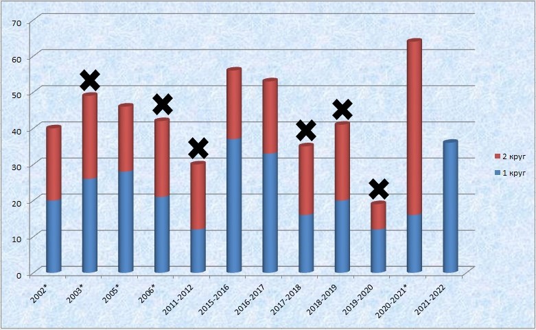 Очки, набранные в первой части первенства (19 турах) - синие, во второй - красные, чёрный крест - финиш в зоне вылета по итогам сезона, * - сезоны, в которых из-за иного количества участников 19 матчей не составляли первый круг.