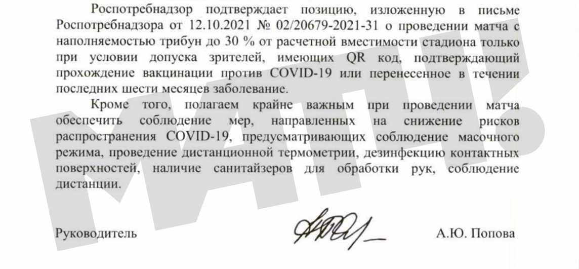Российский футбольный союз и Российская Премьер-лига благодарят Роспотребнадзор за содействие при согласовании возможности проведения матчей и допуска зрителей на трибуны», – говорится в заявлении РПЛ.