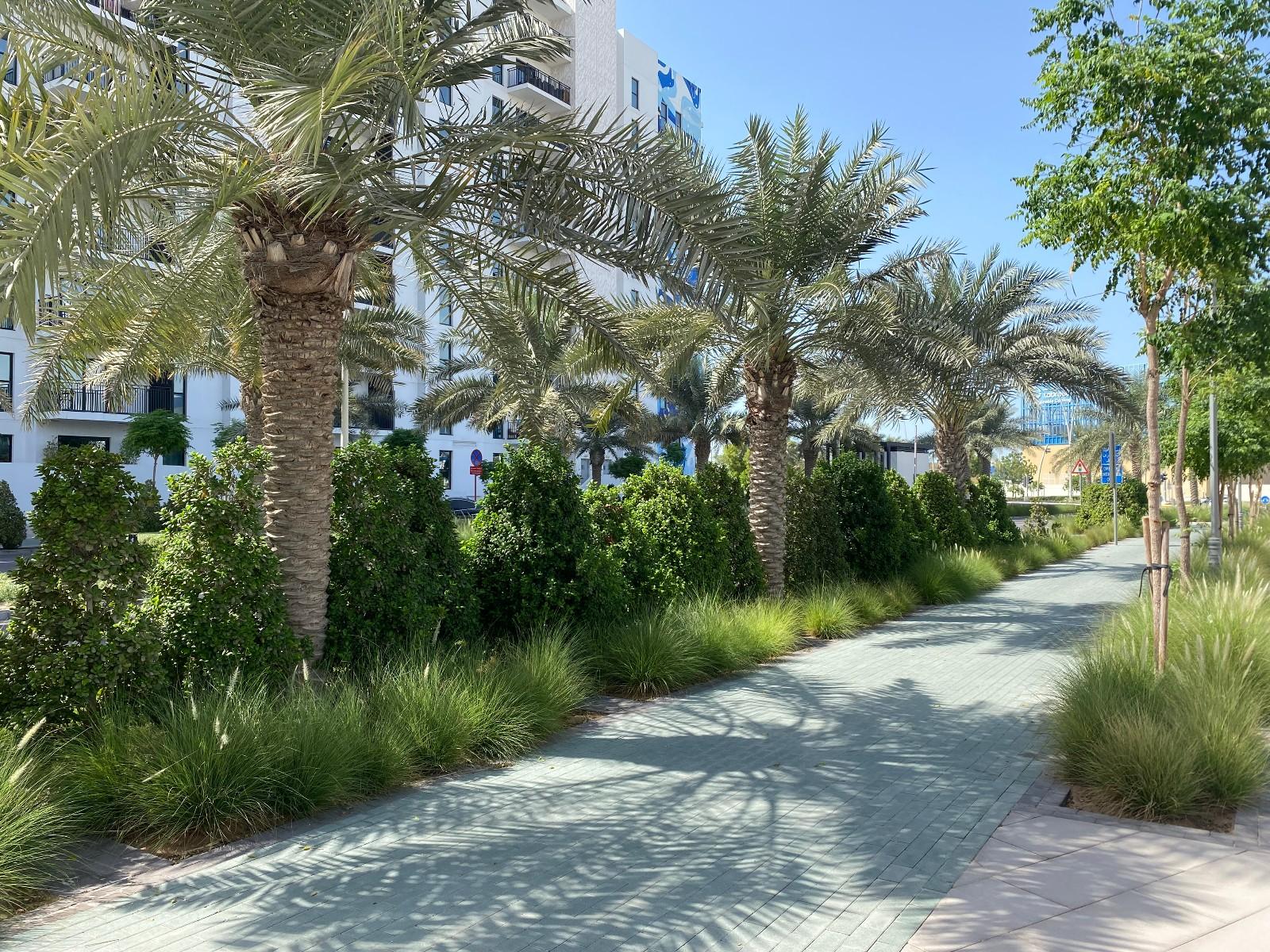 На улице ровно ноль людей. Гулять тут не очень принято, хотя пешеходная инфраструктура на уровне.