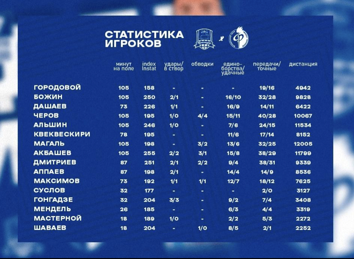 Хочется выразить огромную благодарность нашим болельщикам, доехавшим до матча и сделавшим его домашним. В первом тайме ничего не получалось у Карраскаля и Медины, но во втором оба включились и можно сказать, что это тоже стало переломным фактором. Первый заработал пенальти и забил, второй сделал 1+2. Хочется похвалить Суслова, который провёл неплохой матч и Свинова, который тащил всё возможно и практически невозможное(два выхода один на один). Также, как по мне, стоит оставлять Гонгадзе в запасе и выпускать для освежения игры, убеганий на свежих ногах от уставших защитников.