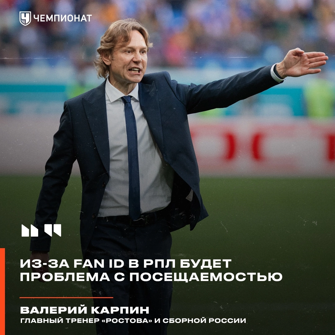 Валерий Карпин о Fan ID:У нас из-за введения Fan ID теперь сто процентов будет проблема с посещаемостью. По моим ощущениям, процентов на 50 посещаемость у нас в Ростове-на-Дону упадёт. Второй момент — где тут спортивный принцип? В Москве болельщики могут приходить без Fan ID, заполнять стадион, а в Ростове вместо 20–30 тысяч придёт пять тысяч человек? Где равенство? Либо вводите Fan ID во всех городах, либо нигде»