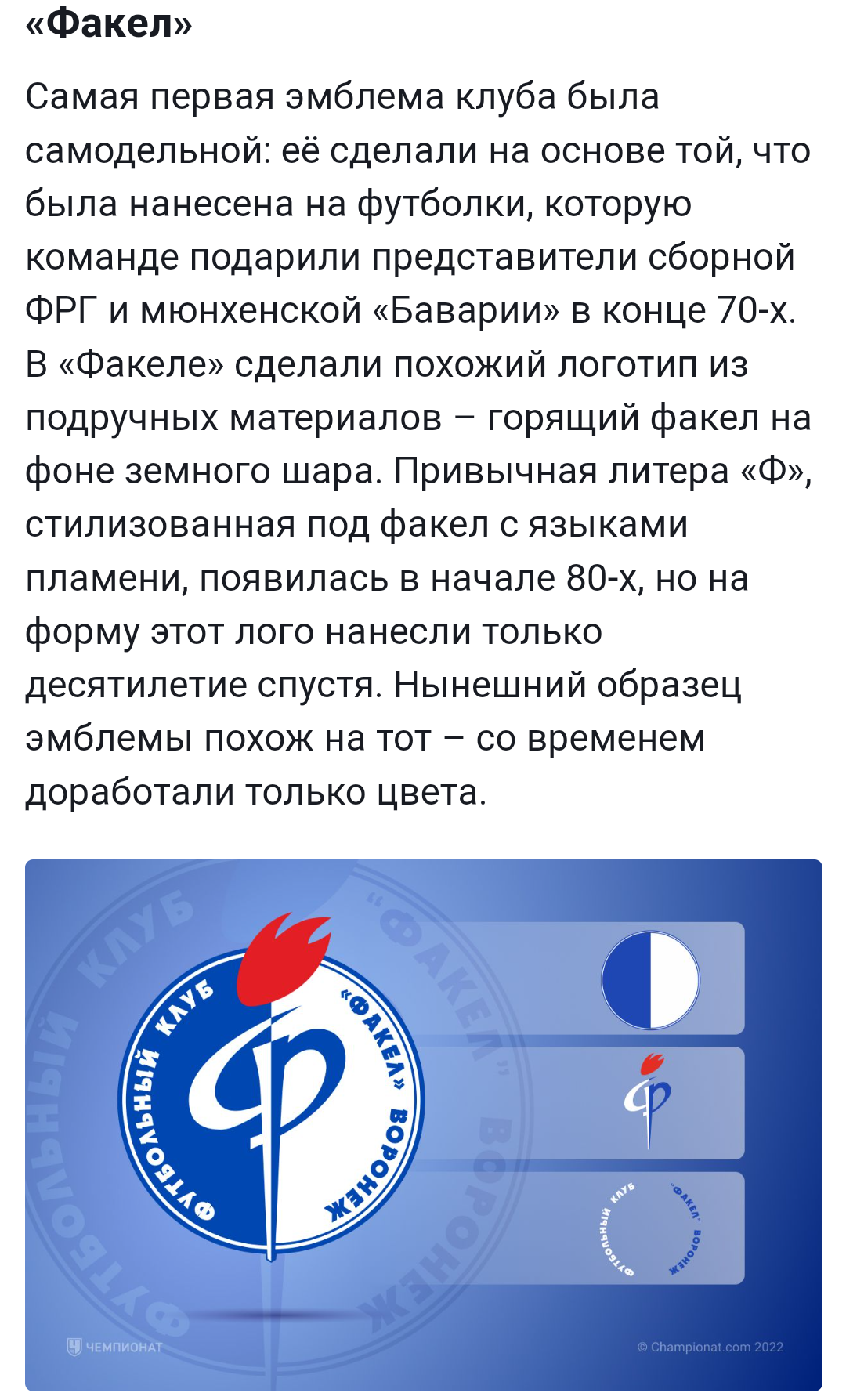 Самая первая эмблема клуба была самодельной: её сделали на основе той, что была нанесена на футболки, которую команде подарили представители сборной ФРГ и мюнхенской «Баварии» в конце 70-х. В «Факеле» сделали похожий логотип из подручных материалов – горящий факел на фоне земного шара. Привычная литера «Ф», стилизованная под факел с языками пламени, появилась в начале 80-х, но на форму этот лого нанесли только десятилетие спустя. Нынешний образец эмблемы похож на тот – со временем доработали только цвета.