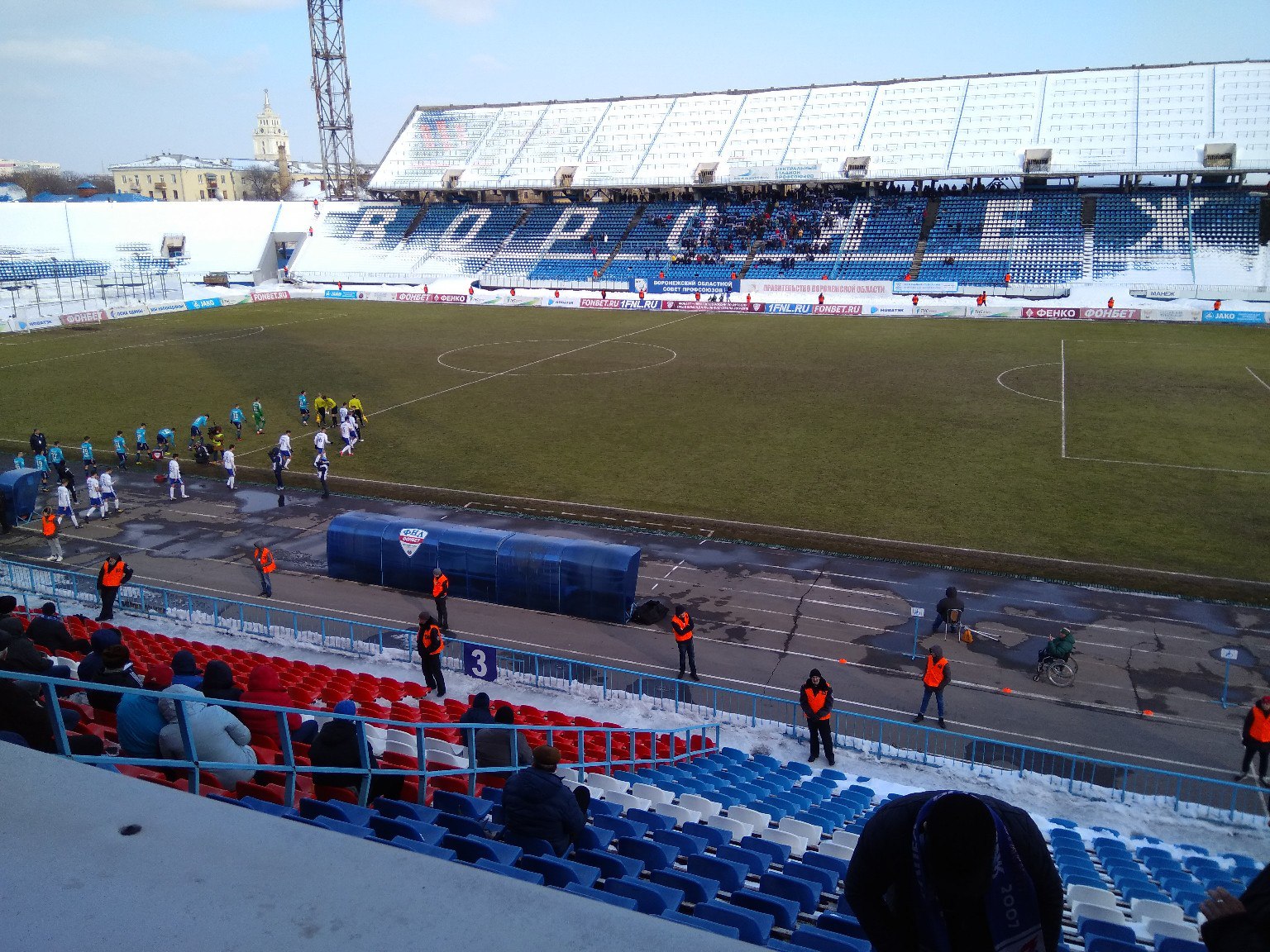 Извините за мат, но люди отвечающие за стадион пидарасы и готов сказать им в лицо это. На лестнице ведущей на Восток на ступеньках был лед, разбиться там легко. Перед матчем с трибуны кричали об этом какому-то хрену из клуба, который обходил стюардов с кем-то, развел лишь руками.