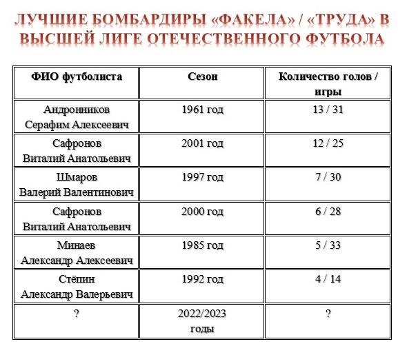 Любопытно. Притом, что по результативности на пройденном отрезке вышки нынешний Факел уступает только Труду-1961, с бомбардирами у нас, как и с победами, пока не задалось…