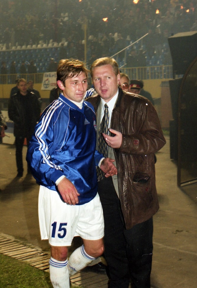 ...пытается что-то донести Виталию Сафронову, только что забившему гол Динамо...