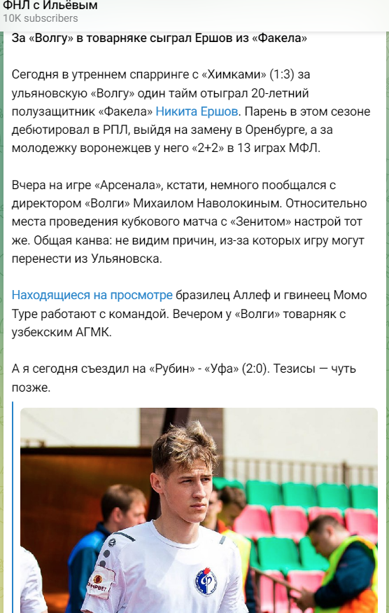 Ильев пишет , что Ершов провел за Волгу один тайм в матче с Химками.