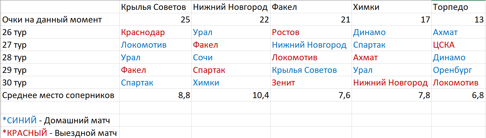 25 тур завершён, а значит пора подводить итоги. Факел феерично обыграл Динамо, а все наши конкуренты не приобрели ни одного очка. Отрываемся от Химок на 4 очка, в одном очке от Нижнего, в 4 от Крыльев. Какая же интригующая концовка нас ожидает. Зенит то стал уже по сути чемпионом, а вот сохранение прописки будет решаться в последнем туре. Вся интрига чемпионата сейчас, это кто сможет сохраниться, а кто вылетит. 25 тур определённо можно занести Факелу в актив.