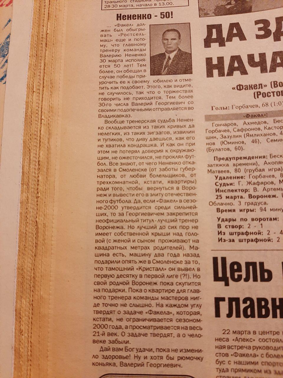 Интересная фраза в этой газетной статье : "задача Факела не ограничивается сезоном 2000 ,а просматривается на весь 21 век ". Кому бы тогда сказали , что будет с Факелом в 21 веке , никто бы не поверил .
