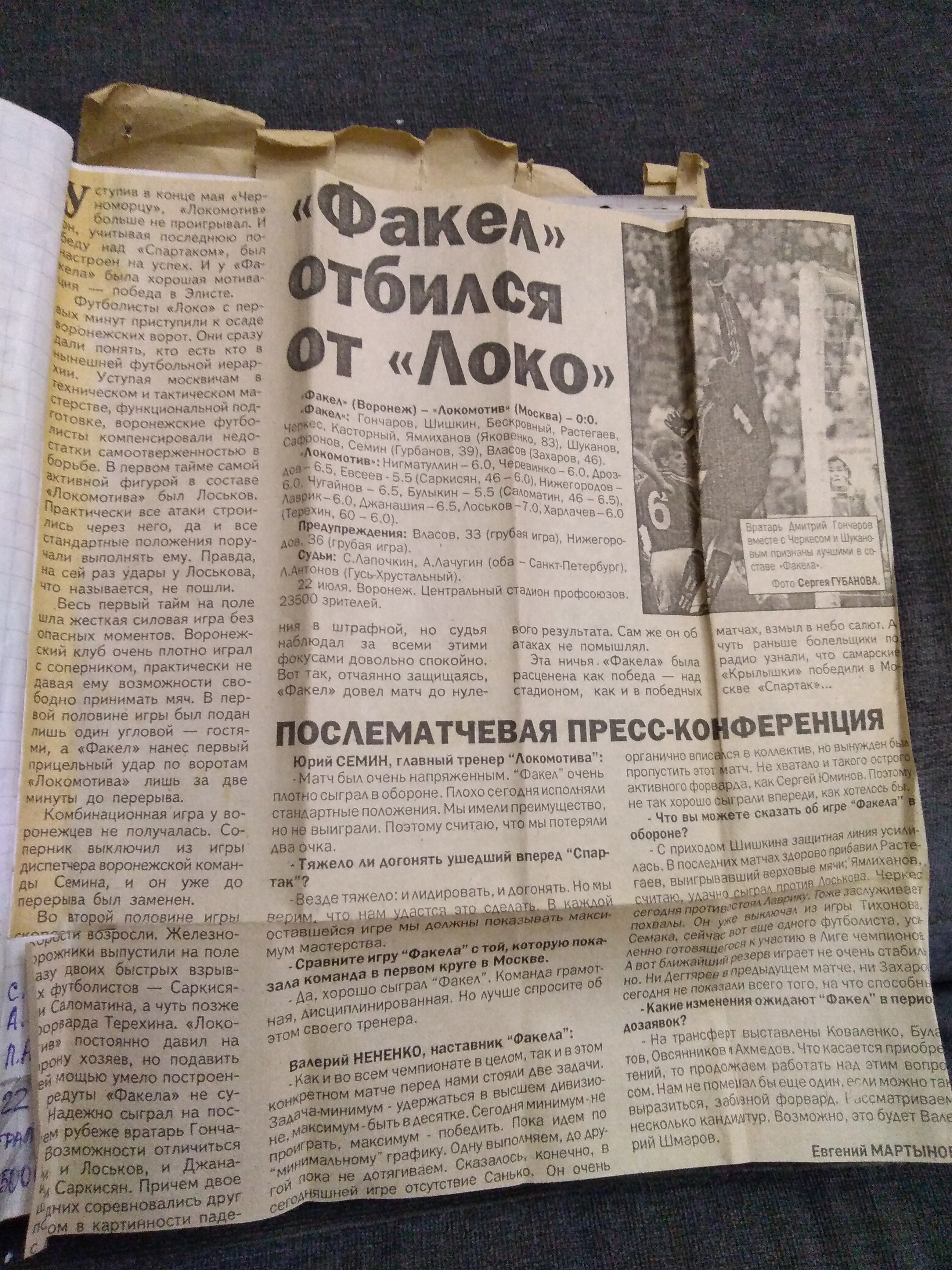 Локомотив, окрыленный победой над Спартаком за неделю до этого, рванул с места в карьер. В первом тайме Факел сдерживал атаки москвичей, а во втором пришлось совсем туго, но на счастье воронежцев кипер Дмитрий Гончаров в тот день поймал невероятный кураж! Как минимум четырежды он вытаскивал тяжелейшие удары соперника практически с ленточки ворот. А суперсейв после удара Лоськова из центра поля до сих пор стоит в памяти! В итоге была зафиксирована нулевая ничья, которая выбесила наставника Локо Юрия Палыча Семина, рассчитывавшего на "железные" три очка. И кажется впервые над воронежским ЦСП прогремели залпы фейерверка не в честь победы Факела, а в результате ничьи. Но она была сродни победе!
