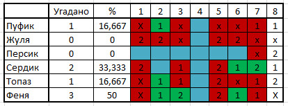 Зачетная таблица котопрогнозов на приз богини Бастет. Из нее видно, что Феня выдает верным каждый 2-й результат.