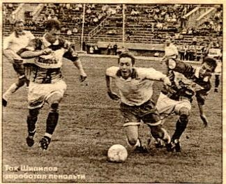 По качеству фото можно было бы подумать, что Антон Шипилов заработал пенальти вскоре после знаменитой встречи Англия-Шотландия 1872 года, но на самом деле это 1997)